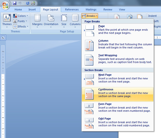 - Now we have to insert a section break between the two parts. To do this, click Page Layout at the top left. Next, click Breaks in the Page Setup box. Then click Continuous under Section Breaks. The first example will show you exactly where this is located. You shouldn’t see anything different about your document once you’ve done this.