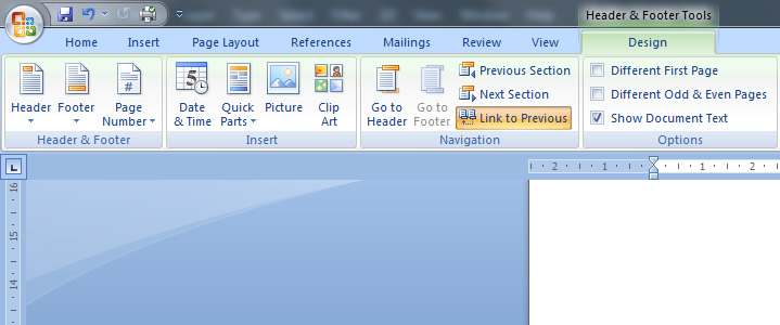 - Double click the page number on the first page where you’d like your regular numbers to appear. At the top of the screen, Design should be selected. If not, click on Design. In the Navigation box, Link to Previous should be highlighted. Click Link to Previous to unselect it. This part is shown in the second example.