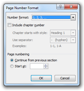 - Next, click Insert at the top left. Then click Page Number and Format Page Numbers. A box should appear like in the third example. In the Page numbering section, Continue from previous section should be selected. Select Start at: instead and type 1 if it doesn’t appear automatically.